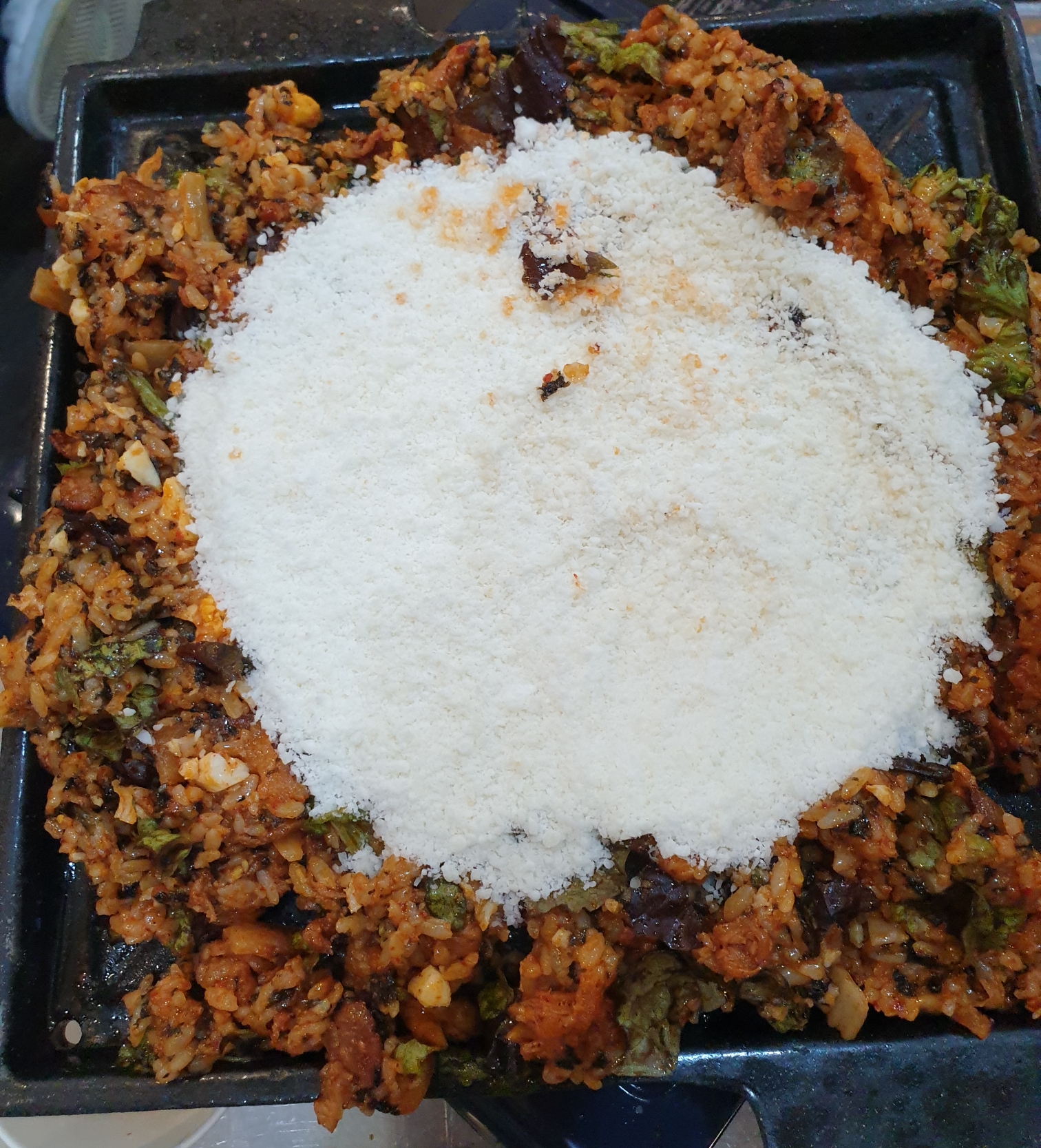 이미 양념되어 비벼져 있는 밥 위에 치즈를 소복하게 올려주세요.