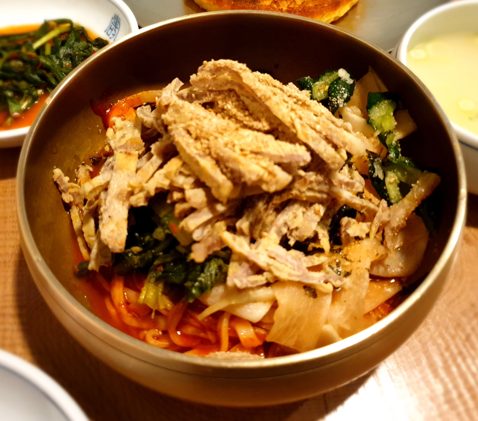 유명한 비빔국수, 칼만두, 녹두전을 주문했습니다.
