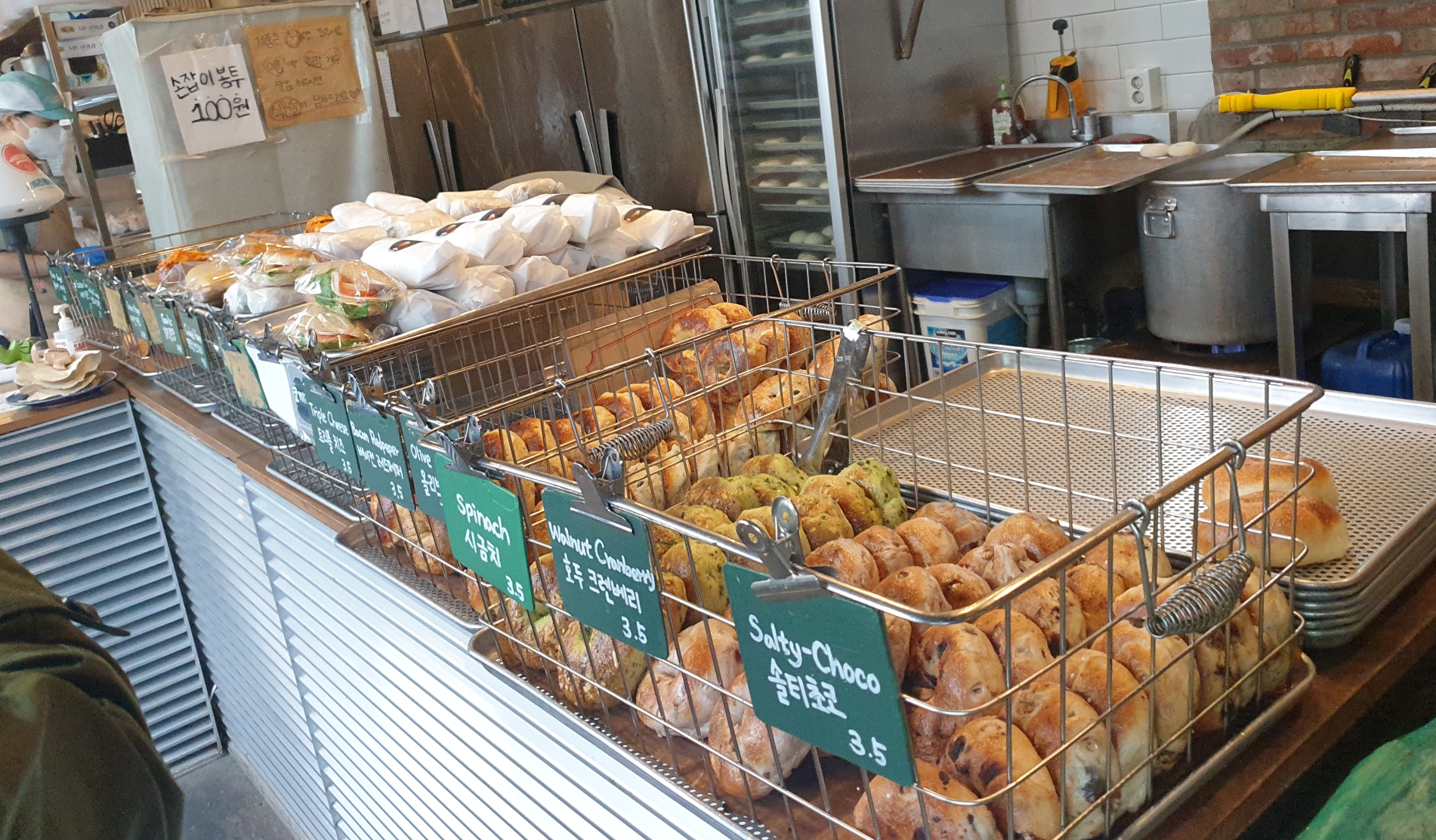 샌드위치는 만드는 데 시간이 걸려서 베이글을 받아 뒤쪽에 서있으면 번호로 불러주세요.